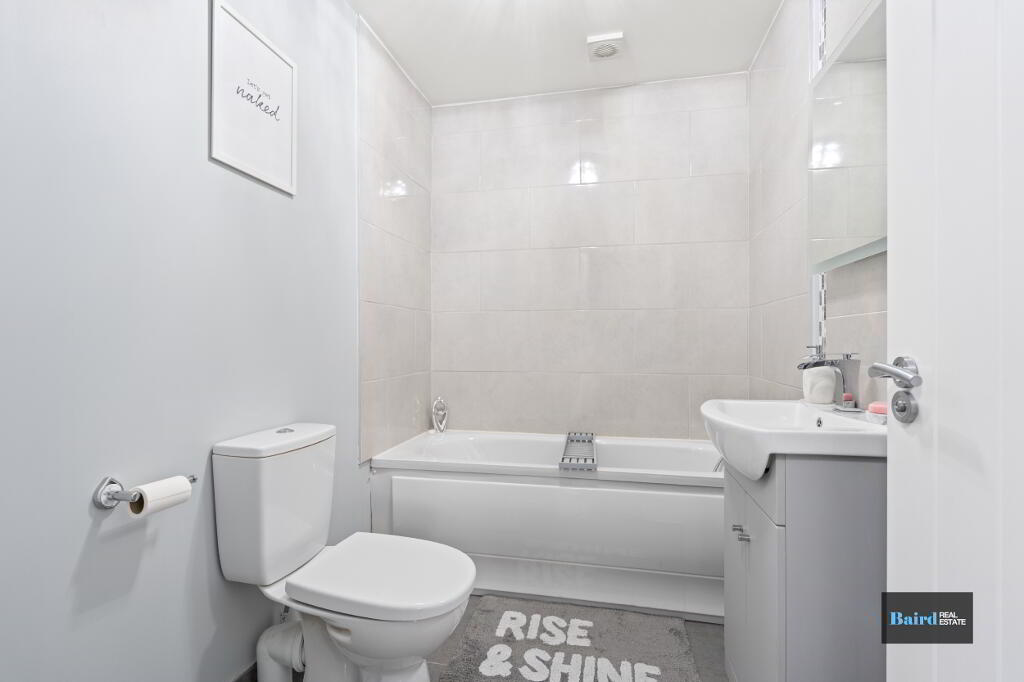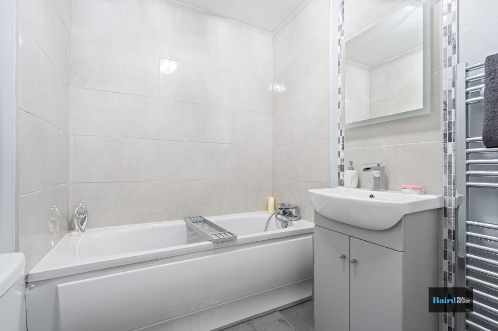 Tiled flooring, white ceramic WC and wash hand basin with storage unit, tiled splashback, chrome heated towel rail, extractor fan and bath with tiled walls.