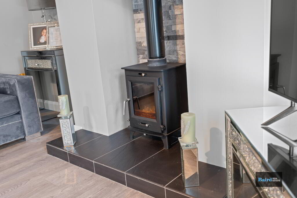Laminate flooring, power points, double panel radiator, tv point, fireplace with wood burning stove, tiled hearth and stone clad inset.