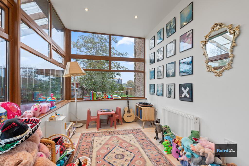 Set on an end site overlooking open countryside, the property enjoys both privacy and picturesque views — a rare combination so close to town amenities.