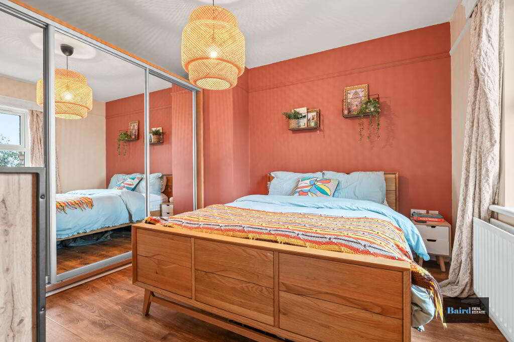 Laminate flooring, power points, double panel radiator and built in mirrored slide robe.