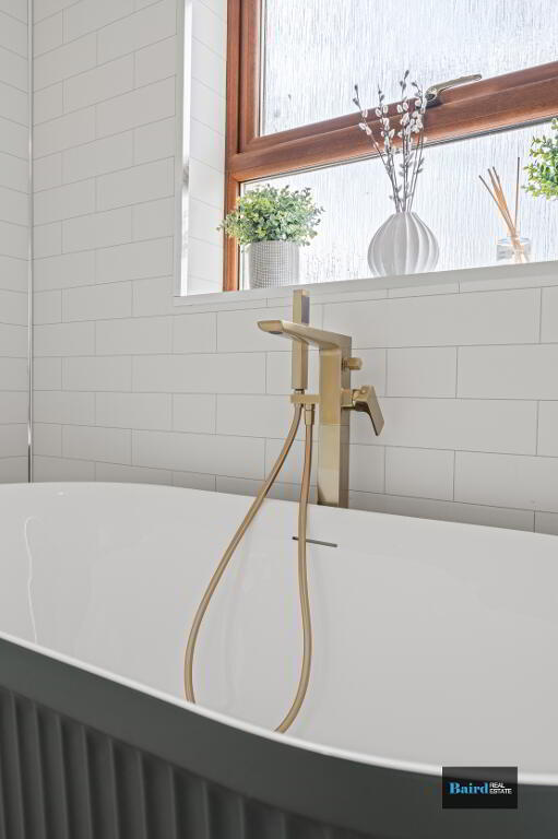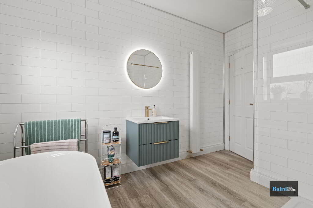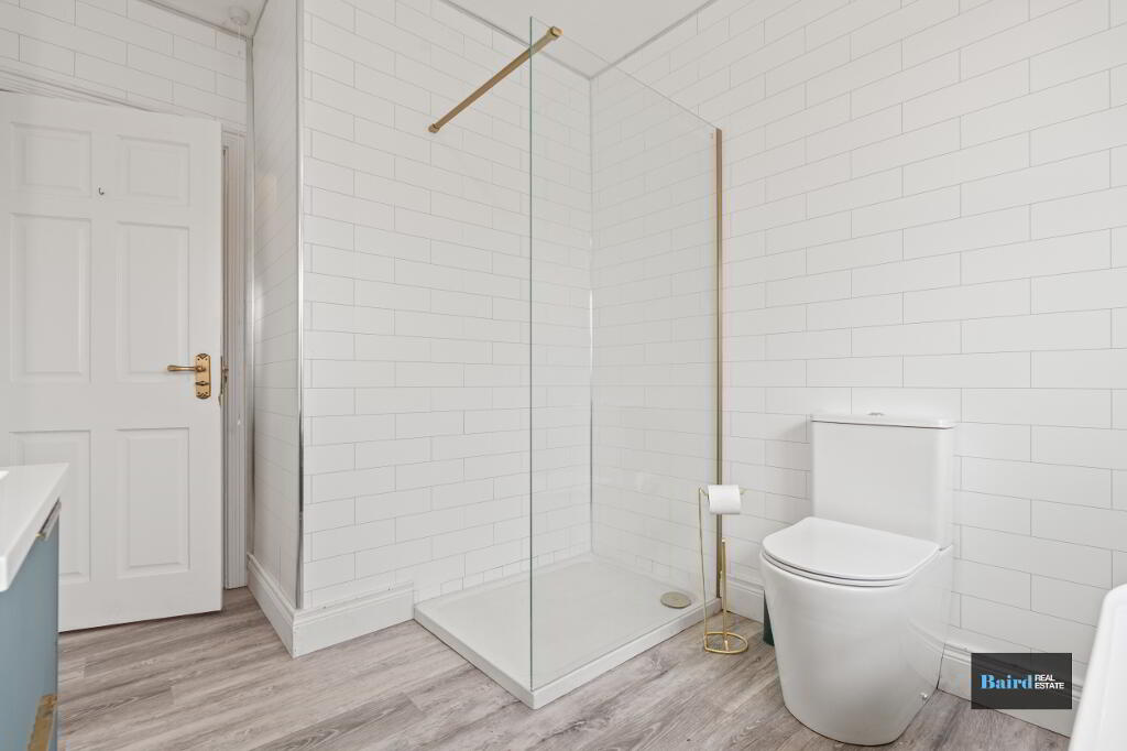 Laminate flooring, free standing bath with brushed brass fittings, Fibo wall panelling, white ceramic WC and wash hand basin, walk in shower, electric shower, heated towel rail.