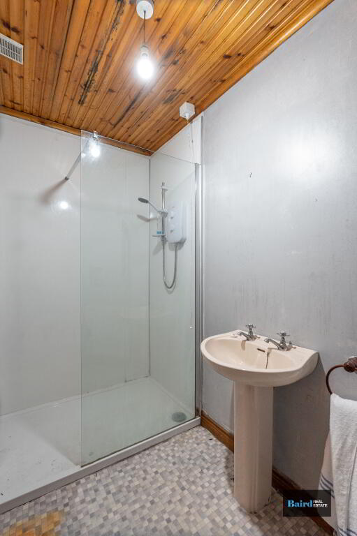 Vinyl flooring, ceramic WC and wash hand basin, extractor fan, walk in shower with redring electric shower unit, double panel radiator, panelled walls at shower.
