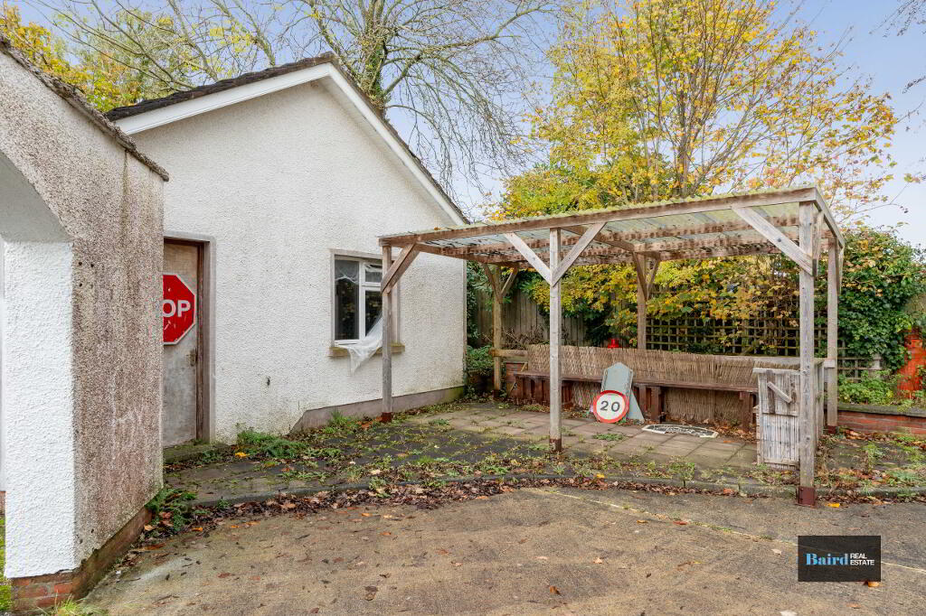 Generous site with garden space to the back, range of mature trees and plant shrubs, tarmacs driveway and small yard to side, extensive gardens to rear with mature hedging, paved patio area, covered patio area, outside water tap.