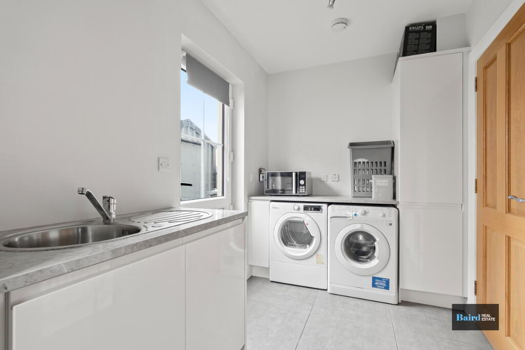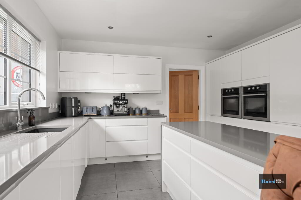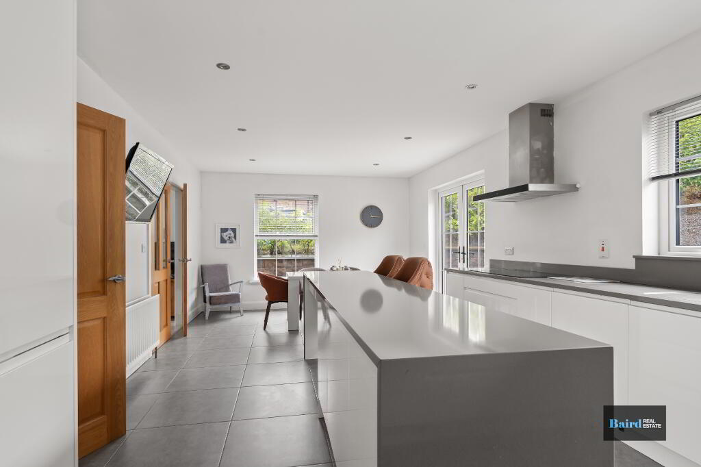 Tiled flooring, double panel radiator x two, power points, TV point, range of high and low level kitchen storage units, kick board lighting, integrated nordemende dishwasher, quartz worktops, blanco sink, integrated bin storage, five ring electric hob, extractor hood, double patio doors in pvc, integrated full length fridge and integrated full length freezer, two integrated nordemende electric fan oven.