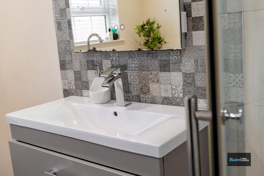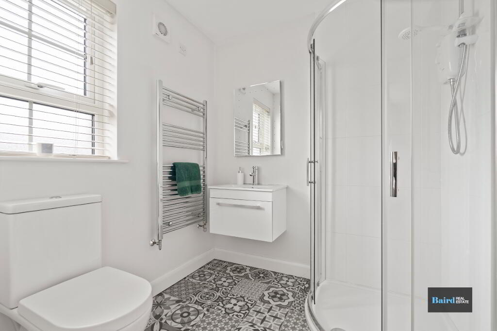 Decorative tiled flooring, white ceramic WC and wash hand basin with vanity unit, wall mounted mirror with lighting, wall mounted chrome heated towel rail, corner shower with triton electric shower unit and panelled walls, extractor fan.
