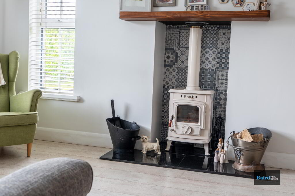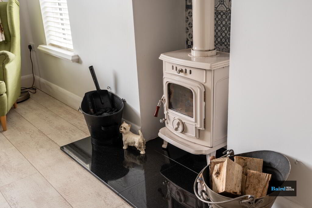 Laminate wooden flooring, double panel radiator, power points, TV point, fireplace with wood burning stove, granite hearth and wooden mantle.