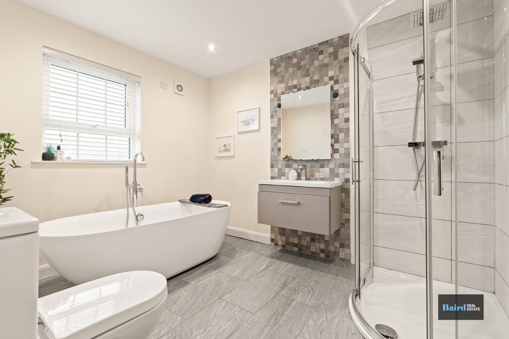 Tiled flooring, wall mounted chrome heated towel rail, corner shower with overhead shower head and tiled walls, shower has a high pressure pump, white ceramic WC and wash hand basin with vanity unit, wall mounted mirror with lighting, decorative tiled splashback, free standing bath with chrome fittings, extractor fan.