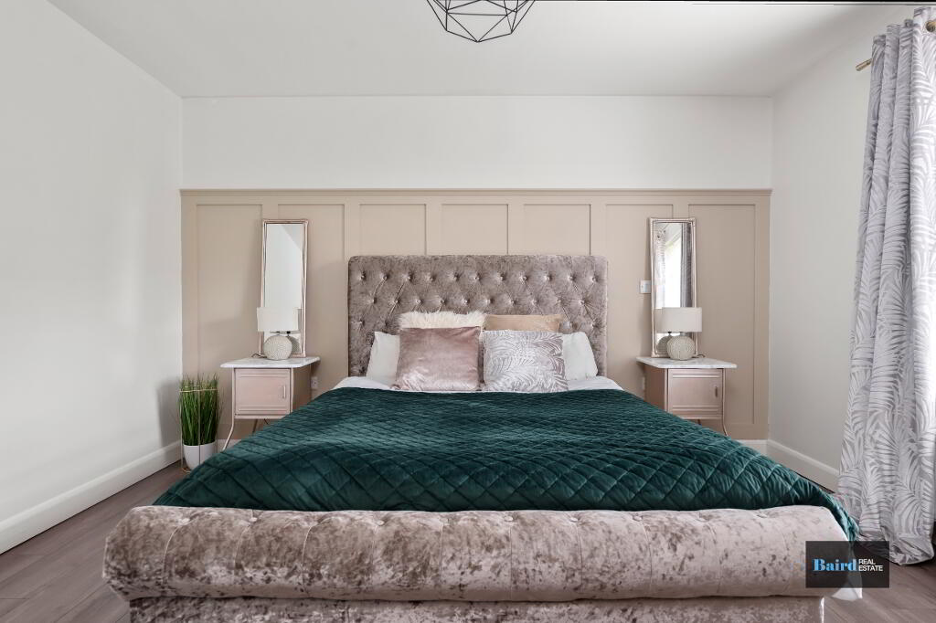 Laminate wooden flooring, double panel radiator, power points, TV point, panelled feature wall.