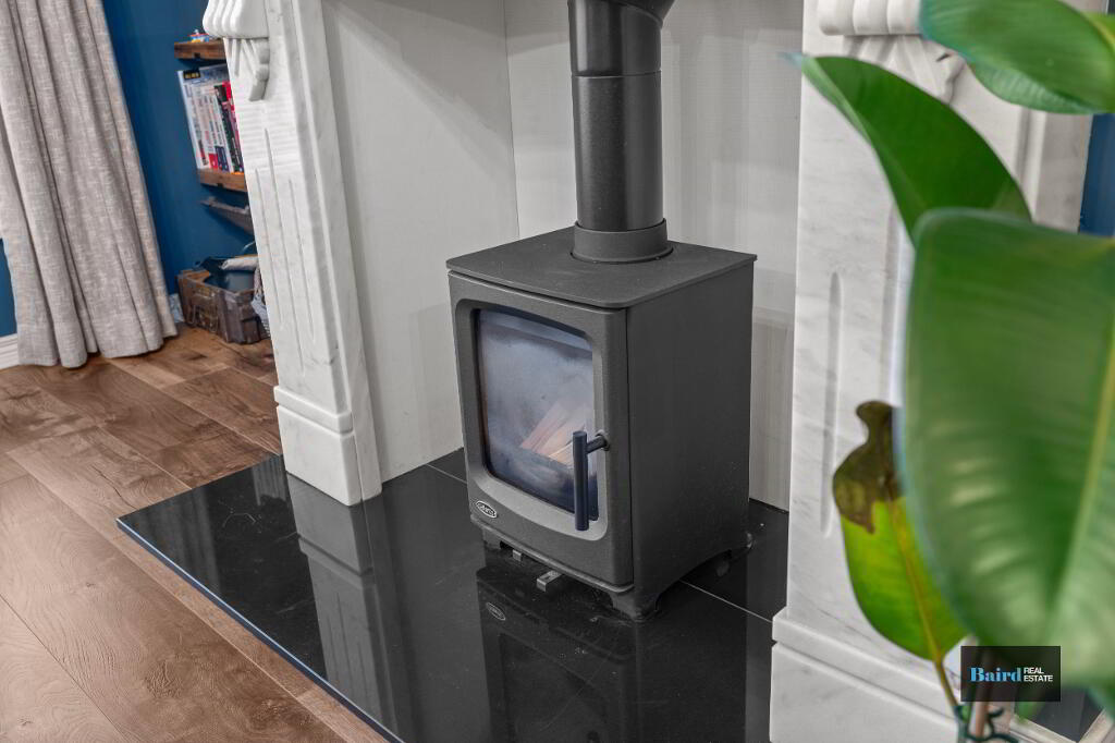Laminate wooden flooring, wood burning stove with granite hearth and marble surround, ceiling coving and centre rose, wooden panelling to walls, double panel radiator, power points, TV point and front aspect window.