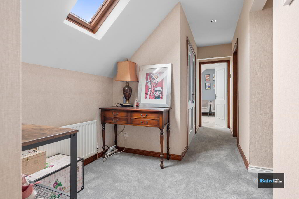 Stairs and landing carpeted, single panel radiator, power points, Velux window, spotlights, hot press with shelving and railed storage space with access to eaves.