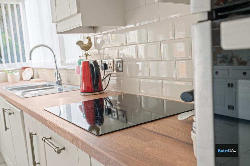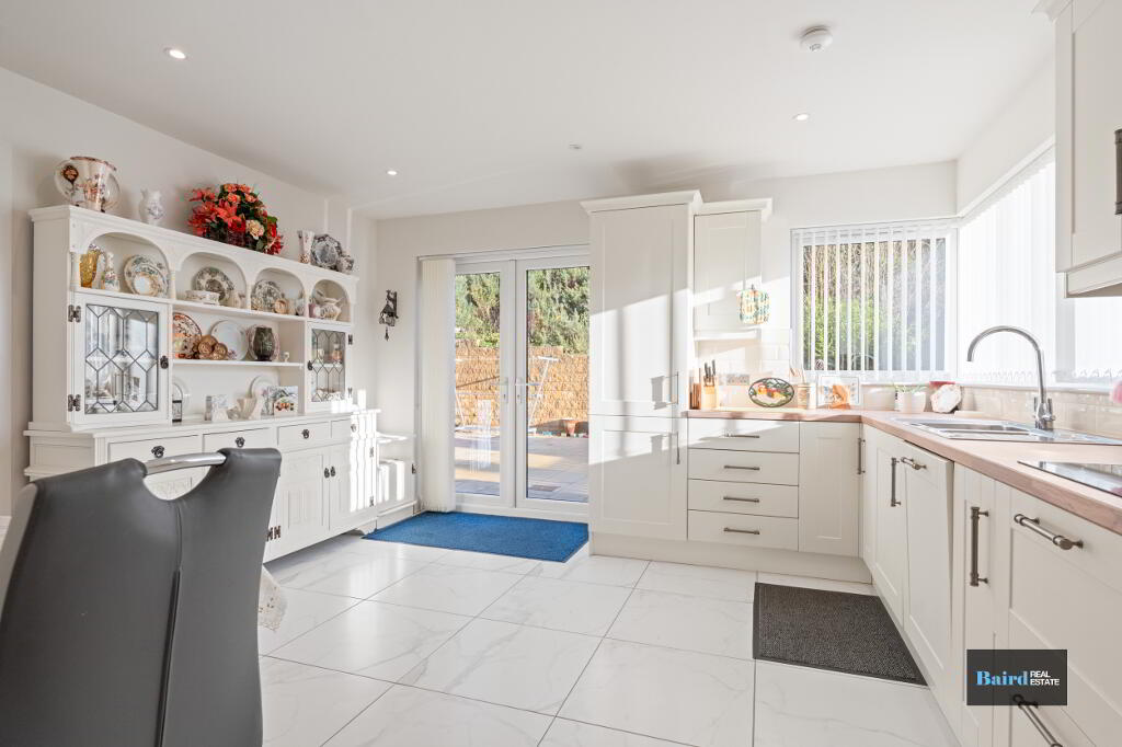 Tiled flooring, range of high and low level cupboards, twin eye-level Beko oven and grill, Beko counter top electric hob, Hoover integrated dishwasher, integrated fridge freezer, 1.5 bowl stainless steel sink and drainer with mixer taps, feature corner windows, double patio doors, power points and TV point, double panel radiator and ceiling spotlights.