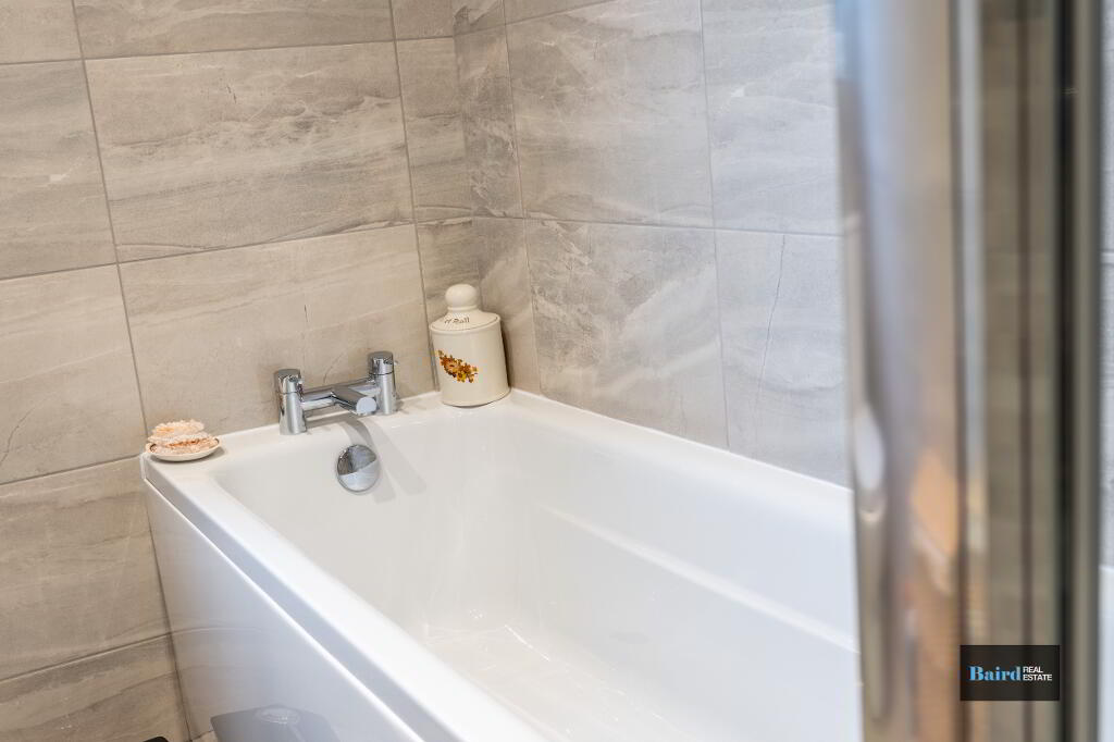 Ceramic tiled flooring, low flush wc, floating whb will wall mounted mirrored cabinet, white panel bath with mixer taps, mains power shower, chrome towel radiator, extractor fan, ceiling spotlights and full tiled walls.