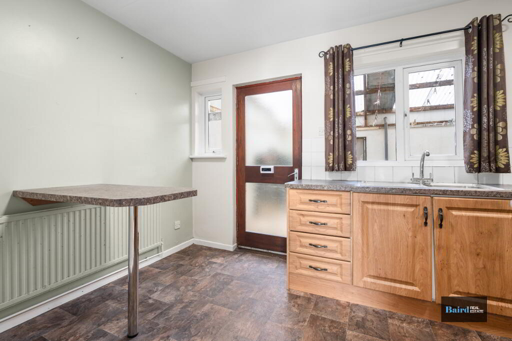 Lino flooring, range of high and low level cupboards, hotpoint electric cooker, stainless steel sink and drainer, breakfast bar, single panel radiator and wooden back door.