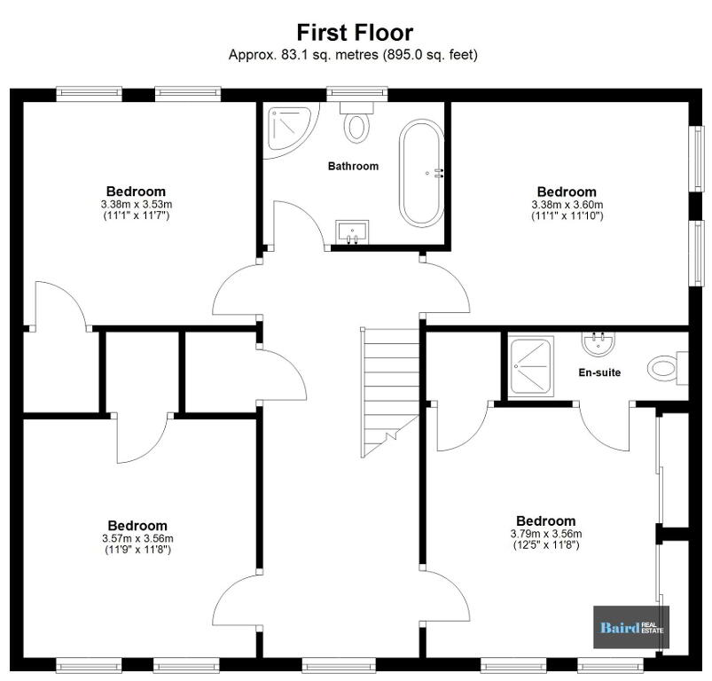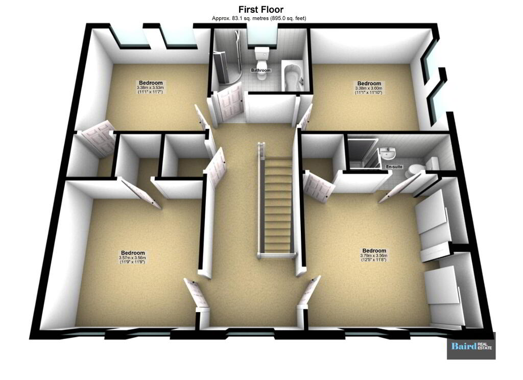 Carpeted, front facing window, double sockets, Oak bannisters.