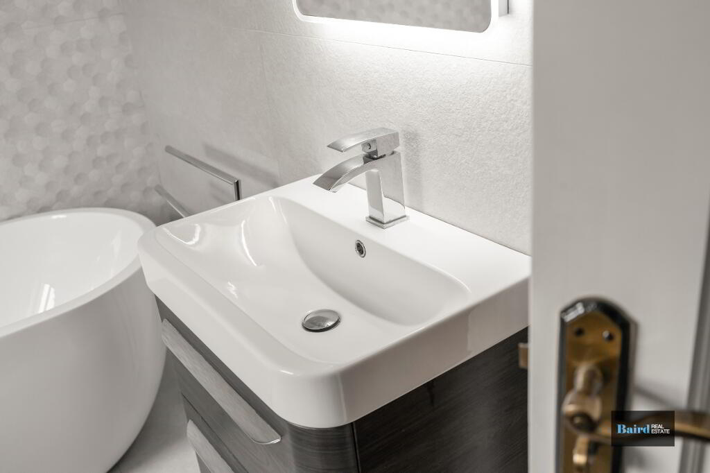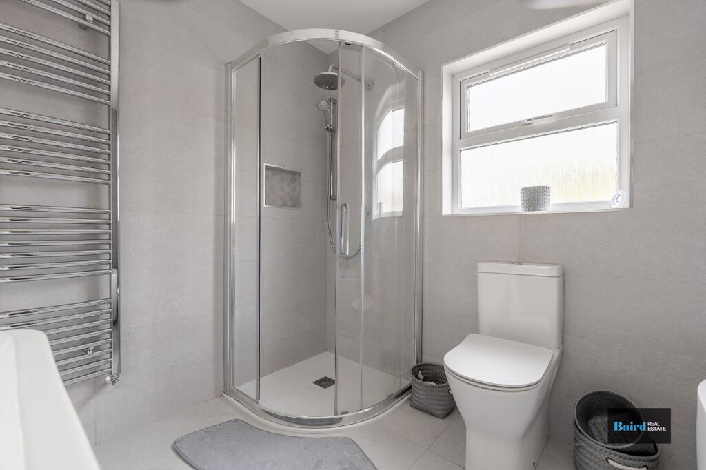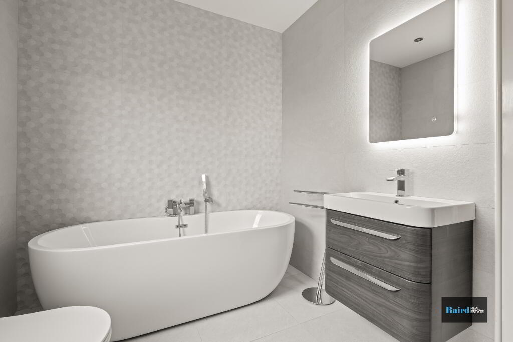 Modern bathroom suite, shower, WC, float sink unit, bath, tiled flooring and walls, spot lights, extractor fan and mirror with touch LED lighting.