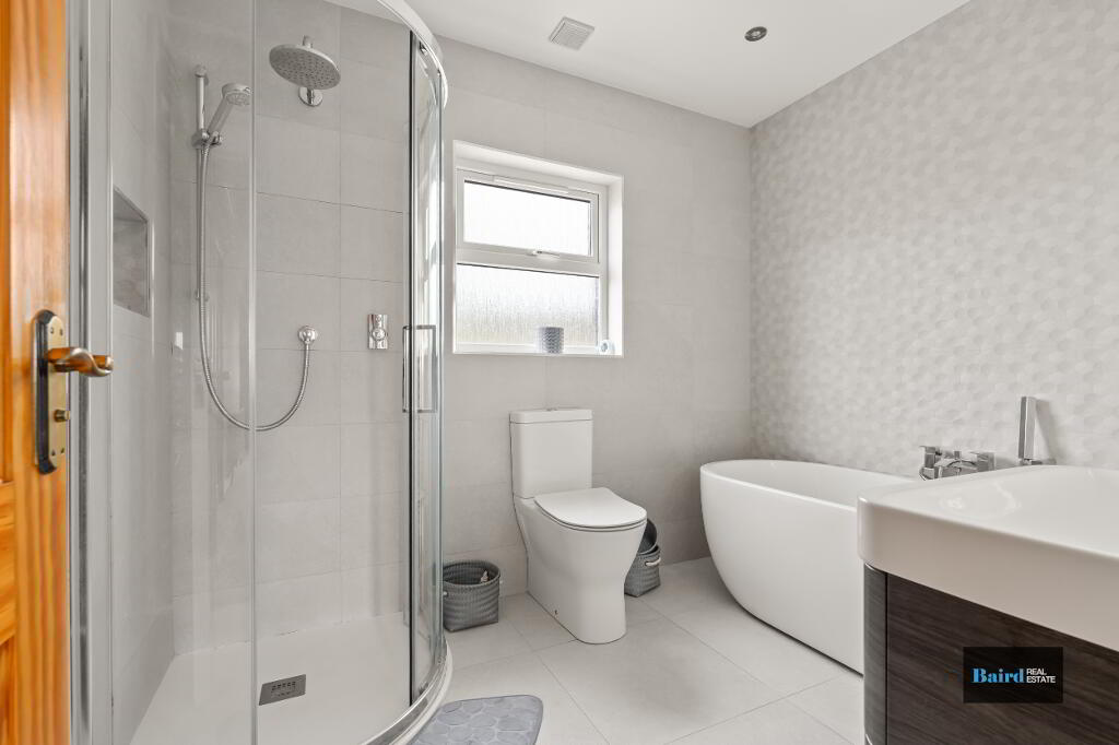 Upstairs, the property comprises four generous bedrooms, including a master with ensuite, as well as a well-appointed family bathroom.