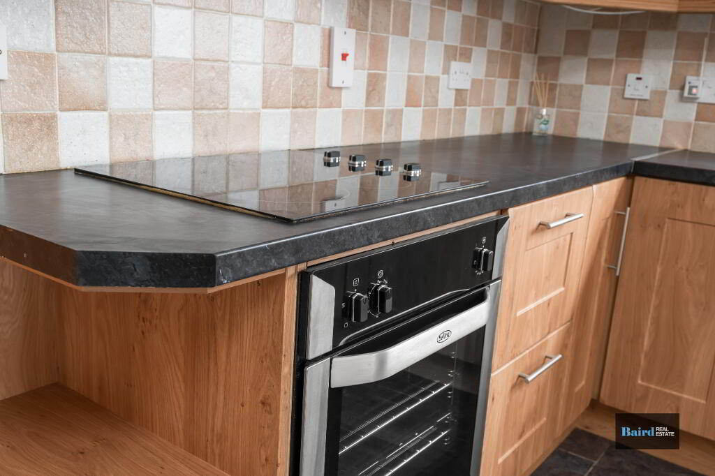 Tiled flooring, range of high and low level kitchen storage units, tiled wall around kitchen units, rear facing window, double sockets and double radiator, integrated electric oven and four ring hob, extractor fan, integrated fridge.