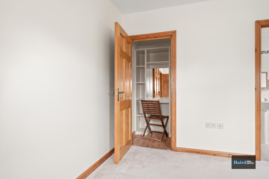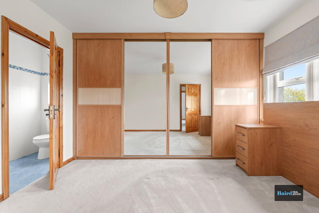Carpeted, built in sliding wardrobe with partially mirrored doors, storage/dressing room with built in storage, double front facing windows, en-suite bathroom.