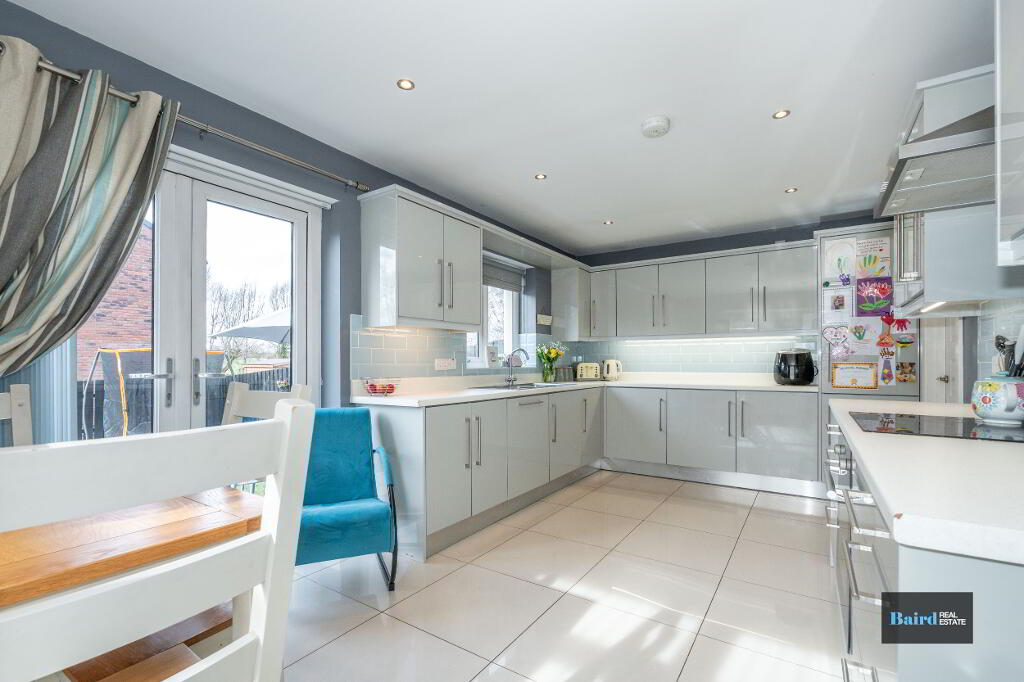 Tiled flooring, range of high and low level cupboards, integrated Fridge/freezer, Bush integrated dishwasher, Hoover oven and grill, Belling 4 ring electric hob, walls tiled between units, 1.5 bowl stainless steel sink and drainer, double panel radiator, bay window, PVC patio doors leading to rear yard, ceiling spotlights, power points and TV point.